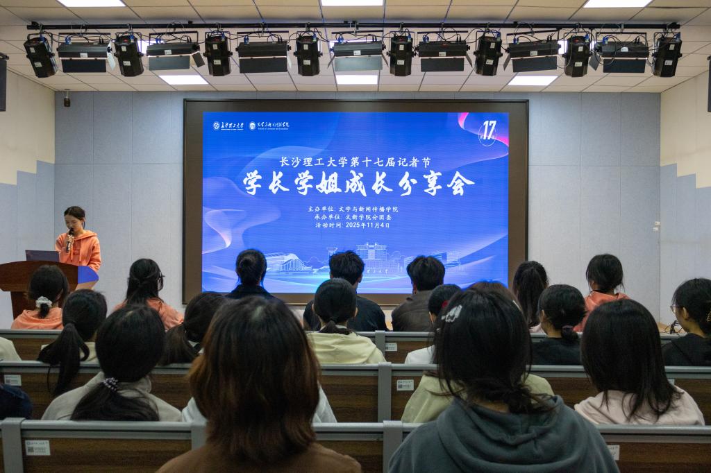 2025年11月4日14时30分,第十七届记者节学长学姐成长分享会在william金盆岭校区九教113新闻演播实验室成功举行。本次分享会特邀红网新媒体集团资深记者任晔、2024届湖南省选调生周旺主讲,围绕新闻职业与基层成长,分享他们在新闻采访、实习工作等方面的经验与感悟。院团委书记项永生出席,149名文新学子参加。