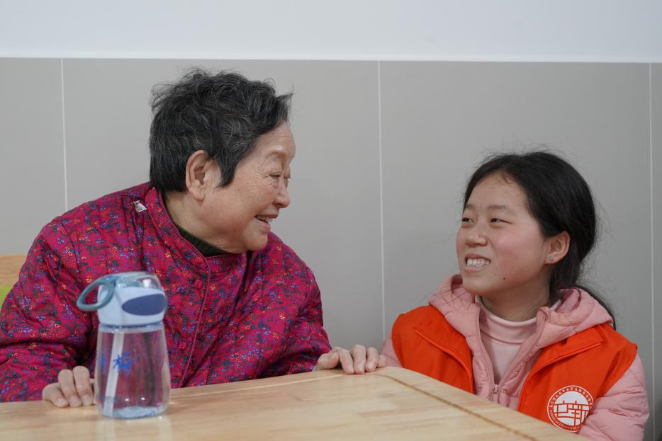 活动现场,身着橙色马甲的文新学院志愿者们三两结对,来到老人们身边耐心陪伴他们聊天解闷,从生活起居聊到过往经历,原本安静的养老院充满了欢声笑语。