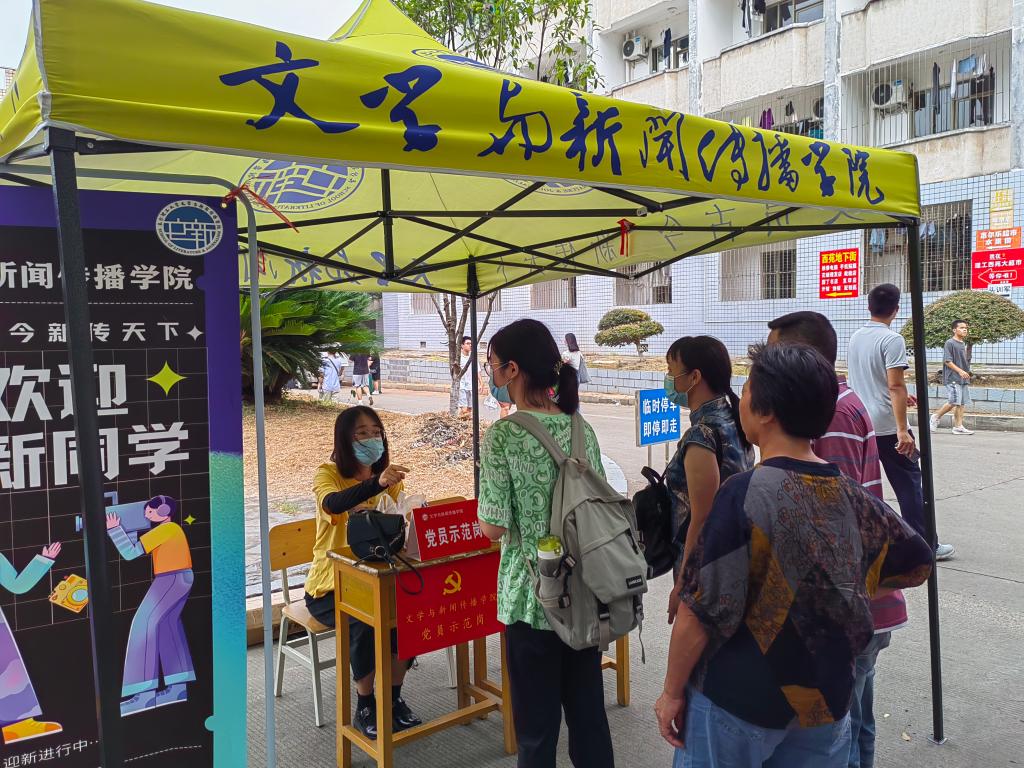 8月28日,文学与新闻传播学院汉语言本科生党支部、新闻学本科生党支部四名党员先锋分为两班,在金盆岭校区西苑二栋旁党员示范岗开展迎新活动,为新生提供注册、咨询服务,协助新生完成入学报到、寝室入住等流程。