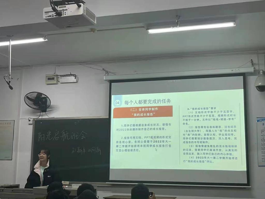 为帮助学生更好地适应大学生活,鼓励学生总结入学期间的收获,尽早制定2022年生活学习目标,明确2022年个人成长方向,增强大家对自我的认识和对未来的规划,2021年12月份,文新学院21级各个班级组织召开了以“阳光启航”为主题的新生班会。