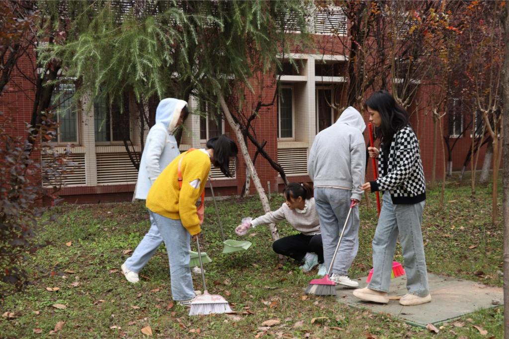 此次卫生区域打扫,同学们分工明确,相互配合。同学们有的在公共草坪区域进行清洁工作,如捡塑料垃圾、碎纸屑等;也有同学在大门前坪进行卫生打扫,如清理落叶、清扫烟头、捡拾外卖包装、检查墙上是否粘贴“牛皮癣”等;还有同学将停放在门口和马路上的电动车、自行车摆放得更加整齐有序并劝导学生规范停电动车。