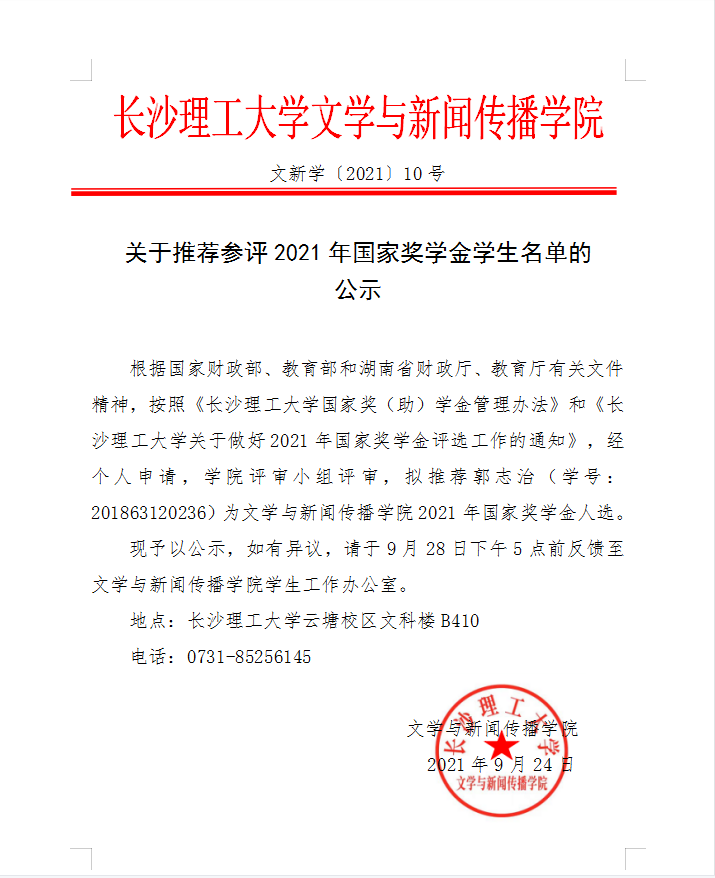 文学与新闻传播学院关于推荐参评2021年国家奖学金学生名单的公示