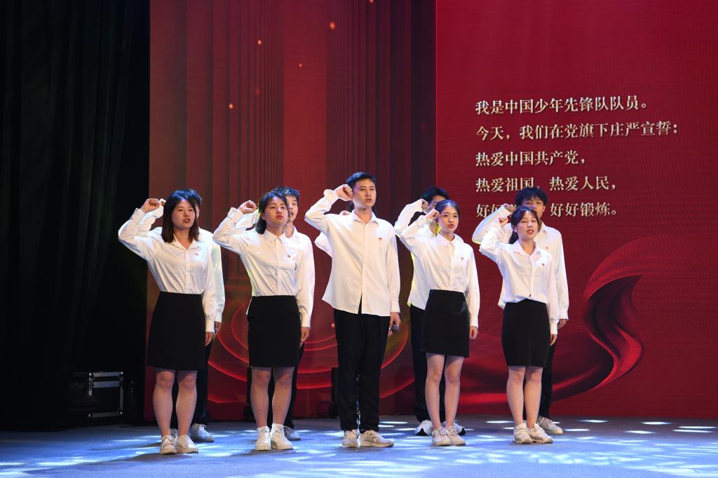 演出最后,由三十名宣誓者带领全场观众在党旗下宣读誓词,我院党员代表王馨瑶等10人作为领誓人带领全场党员表示会对党忠诚,积极工作。伴随着《没有共产党就没有新中国》的音乐下,此次展演正式落下帷幕。