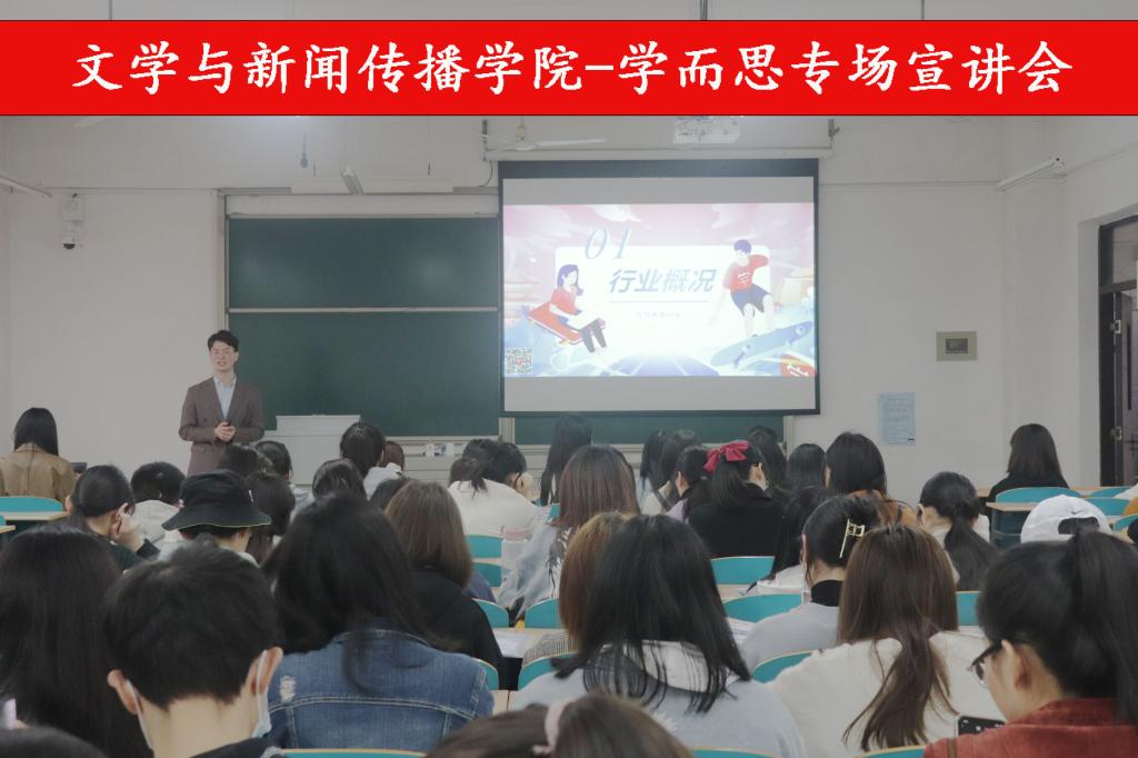 2021年3月15日下午,文学与新闻传播学院-学而思专场宣讲会于文科楼B403召开。此次宣讲会分为介绍行情、企业介绍、招聘岗位、薪酬福利、培训体系、活动开展、招聘流程七个部分。