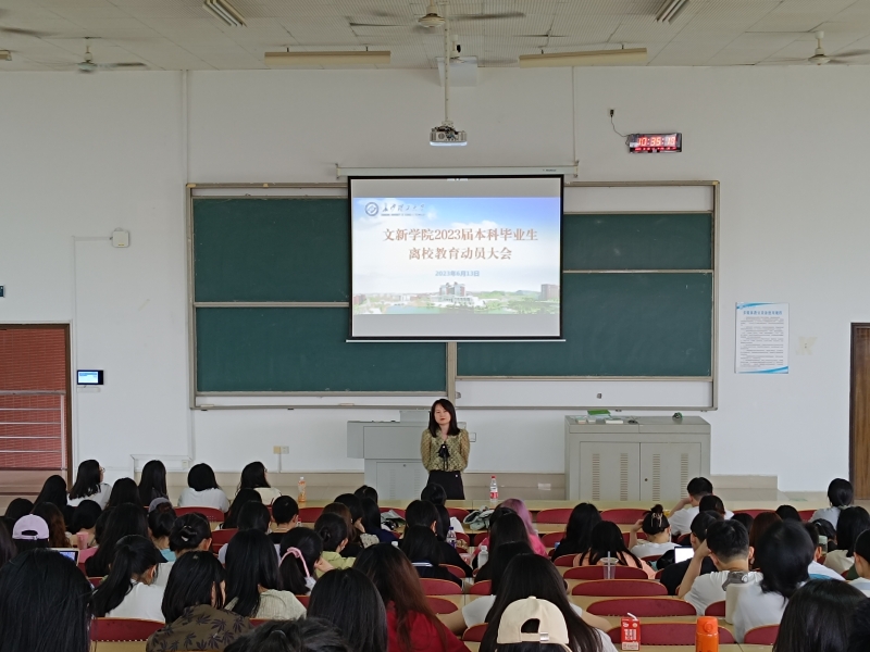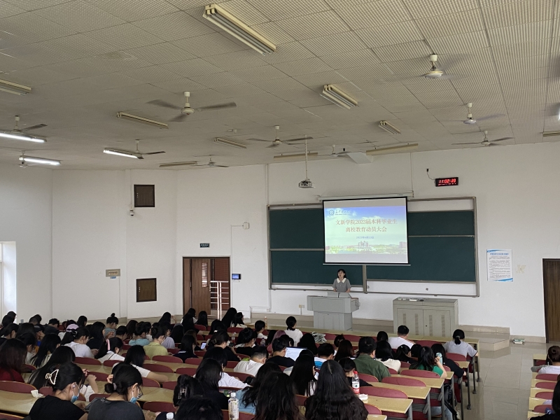 6月13日上午,文新学院在综教B302举行2023届本科毕业生离校教育动员大会,院党员副书记刘莎出席,年级辅导员李婵主持,全体本科毕业生参加。