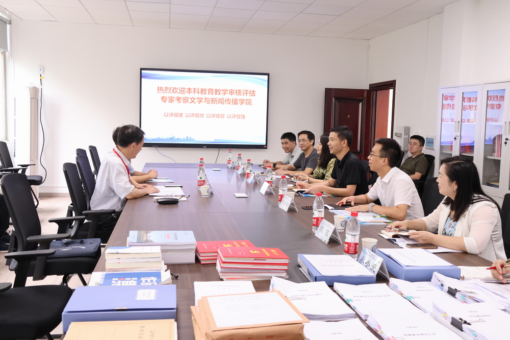 院长刘建新从学院简介、审核评估的自评综述、特色项目和存在主要问题和改进措施等四个方面对学院现状作了详细介绍。他首先介绍了学院在学科建设、专业发展、科研成果、学生竞赛、学生就业方面的基本情况,并结合自评报告汇报了学院办学方向与本科地位、学生培养过程、教学资源与利用、教师队伍及学生发展情况、教学质量保障与成效,着重强调要打造“文理(工)交叉、文新融合、文文互补”的一流本科专业。柳见成教授围绕我院汉语言文学、新闻学、网络与新媒体三个本科专业就办学定位、师资队伍建设、专业特色优势发挥等问题与学院领导班子、相关专业负责人进行了深入探讨和交流。