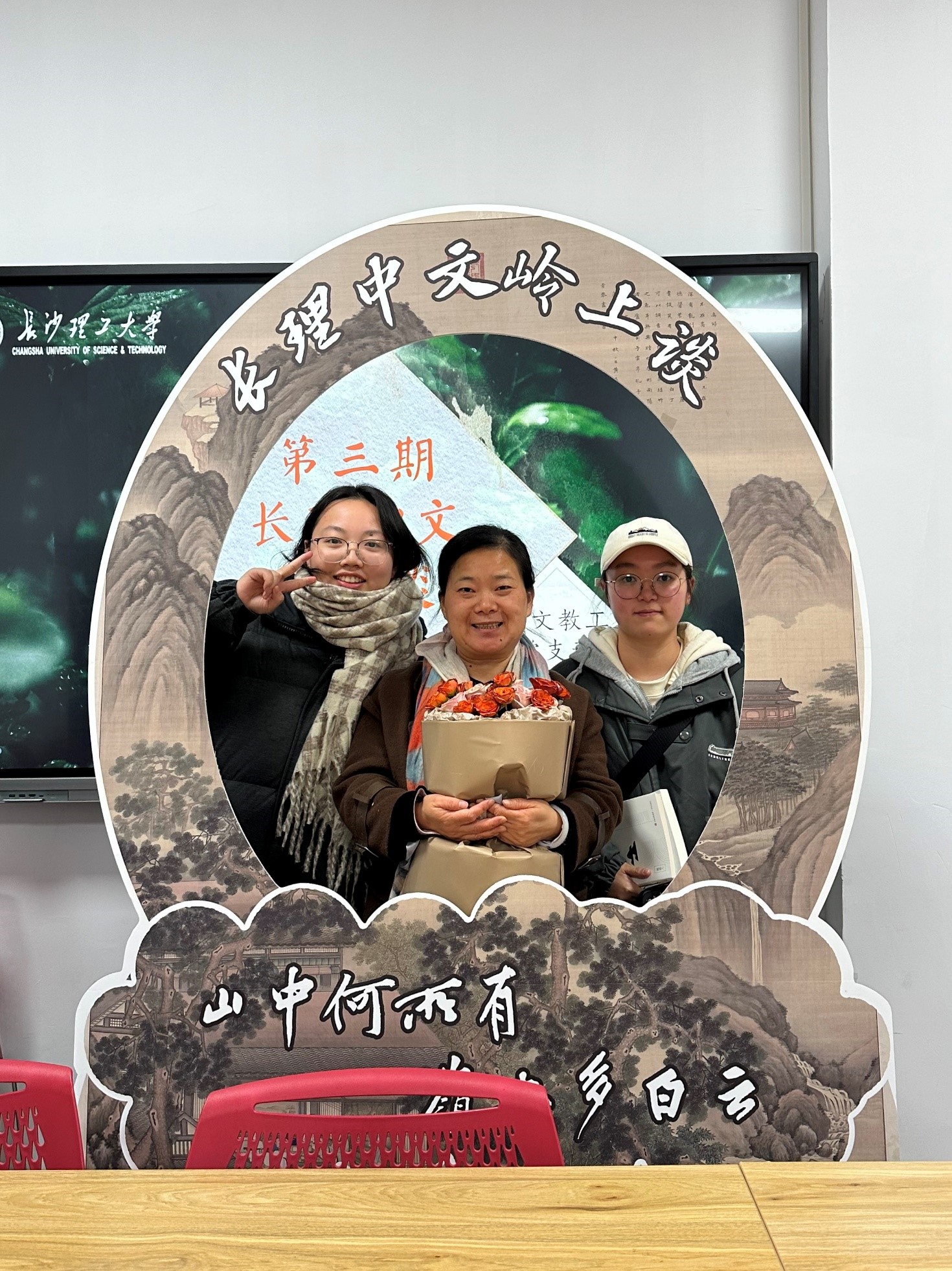 此次活动正值新年来临之际,除了传统的抽奖赠书环节,中文教工支部委员会还为同学们准备了封面印有“不负韶华”“前程似锦”等祝福语的笔记本和其他礼物,表达了对同学们的新年祝福。同学们也为谢老师准备了小惊喜,送上了“火焰变玫瑰”的小魔术,活动现场充满了欢声笑语。