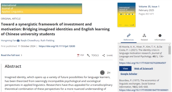 Fan, H., Chowdhury, R., & Fielding, R. (2024). Toward a synergistic framework of investment and motivation: Bridging imagined identities and English learning of Chinese university students. International Journal of Applied Linguistics, 35, 457-471. https://doi.org/10.1111/ijal.12630