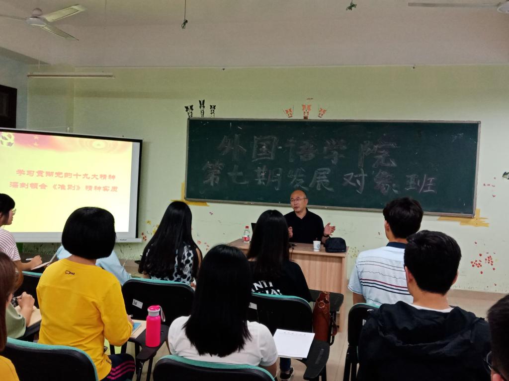 5月9日晚,外国语学院第七期发展对象培训班第一讲在文科楼A503教室开讲,学院党委书记甘为主讲“党内政治生活的若干规定”。