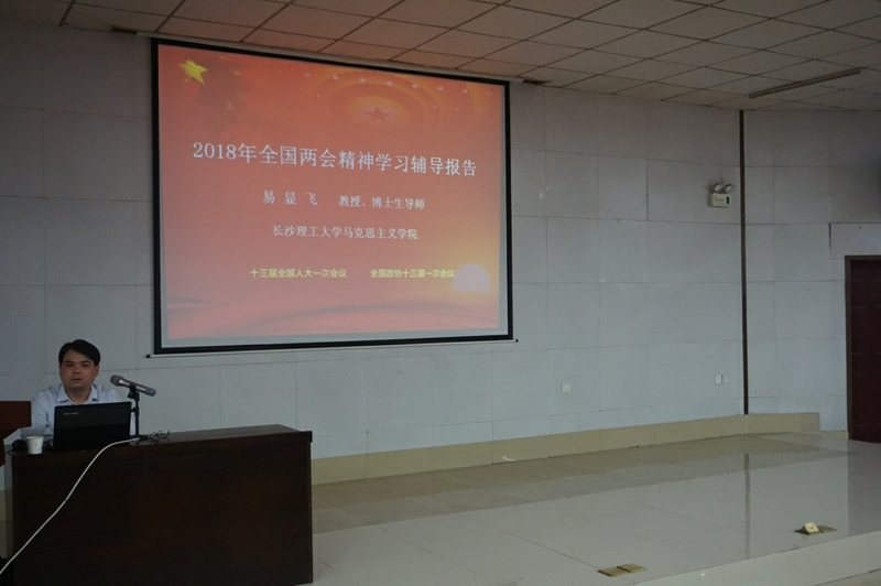 2018年5月29日下午,外国语学院在文科楼A100圆厅组织2018年两会精神专题学习,邀请马克思主义学院党委书记易显飞教授作报告。学院全体教职工、学生党员和发展对象参加集体学习。