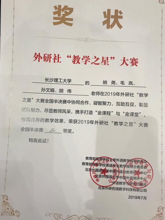 8月1--2日,外语教学与研究出版社2019年“教学之星”大赛全国半决赛在武汉成功举办。近700位高校英语类专业教师齐聚一堂,或参赛,或观摩,或研讨。我院外国语言文学系姚尧、毛岚、孙文娟、胡伟组成的团队作为湖南省的唯一代表,参加了这次全国级的角逐,并努力拼搏,荣获全国半决赛二等奖。