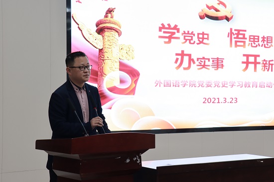 3月23日下午,外国语学院在文科楼A100圆厅学术报告厅举行党史学习教育启动仪式。学院党政班子成员以及全院师生党员、发展对象共计200余人参加仪式。仪式由专职组织员汪功伟主持。