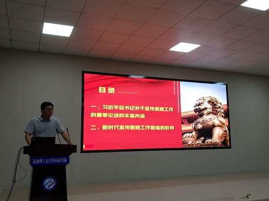 张明海教授以《习近平总书记关于宣传思想工作的重要论述》为题,他从习近平总书记关于宣传思想工作的重要论述的丰富内涵、新时代宣传工作面临的形势等两个大方面展开论述。