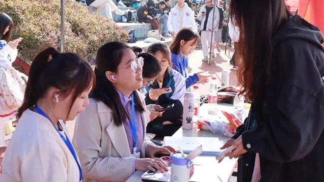 团委学生会成员们和热心的同学们一起坚守在外国语学院大本营为运动员们安排一对一志愿者,提供后勤保障和加油鼓气,做运动健儿们坚实的后盾。