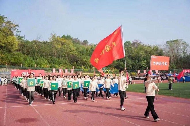 迈着自信步伐的他们,展现外国语学院的气宇轩昂喊出:“学参中外,语汇天下;文化摆渡,与理同行。”