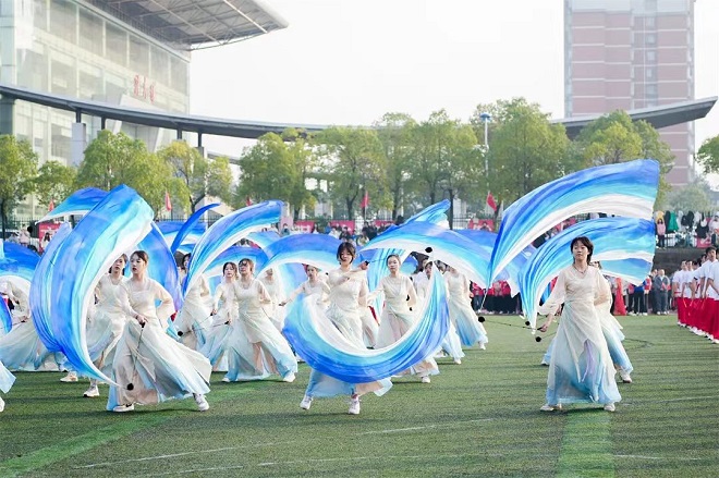 团体操的外语人们场上的他们肆意地绽放青春的色彩。