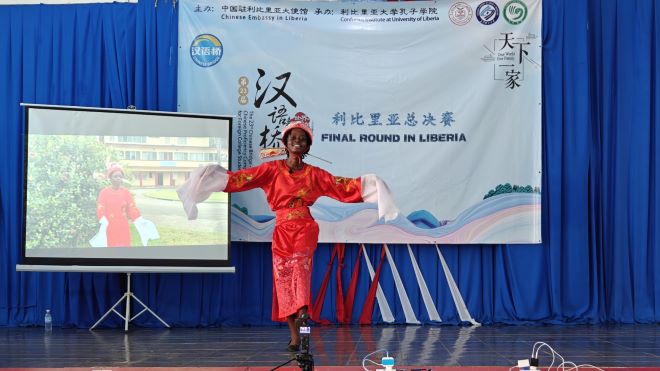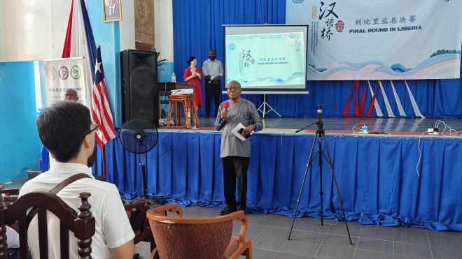 2024年5月17日,利比里亚大学孔子学院在利大国会山校区隆重举办了第23届“汉语桥”世界大学生中文比赛预选赛利比里亚赛区总决赛。中国驻利大使尹承武阁下、利比里亚教育部助理部长Nyensuah女士、利比里亚广播电台台长Faghon先生、利比里亚大学代理校长Taylor教授、中资企业和机构代表以及利大孔院师生近300人参与活动。部分孔院教学点学生和武术课堂的学员进行了暖场表演。利国多家主流电视、广播及网络媒体对此次活动进行了现场直播和新闻报道。