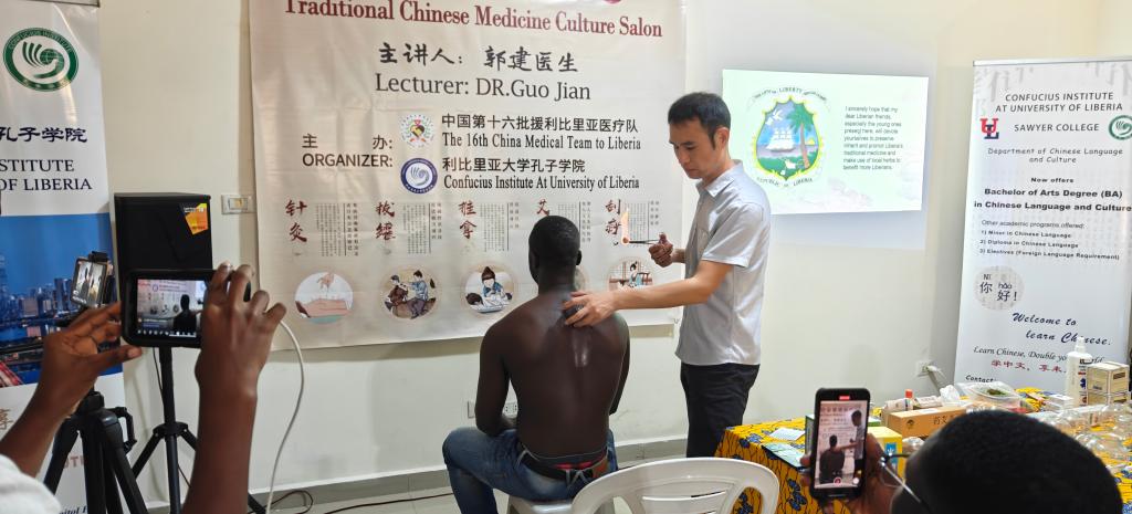 在热烈的掌声中,医疗队队长郭建医生走上讲台,以“传统医学——祖先留给我们的宝贵财富”为题,结合图片及视频、各种中成药及中医医疗器械实物展示等多重形式,生动地表现了中医药文化的历史底蕴、丰富内涵和伟大成就,并向观众们演示了针灸、艾灸、拔罐、刮痧、耳穴压豆、推拿、正骨等多种中医疗法,旨在以中医药传承与发展为案例,唤起利比里亚青年发掘、保护和传承利比里亚乃至非洲传统医学。