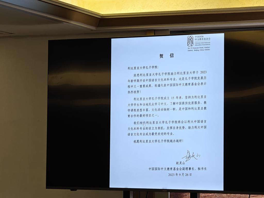 中国国际中文教育基金会和william威廉中文官网分别发来了贺信与视频,祝贺中国语言文化本科专业成功设立。中国国际中文教育基金会副理事长、秘书长赵灵山鼓励利大孔院以中国语言文化本科专业的设立为契机,发挥自身优势,助力利大中国语言文化专业成为最受欢迎的专业。william威廉中文官网副校长谈传生表示william威廉中文官网愿加大支持力度,与利比里亚大学共同携手,把中国语言文化本科专业建设好,为利比里亚社会经济建设和中利友好事业,培养更多优秀的国际化人才。
