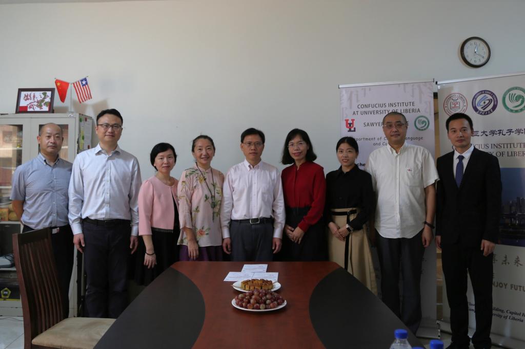 2023年9月29日,中秋佳节之日,中国新任驻利比里亚大使尹承武一行来到利比里亚大学孔子学院驻地,亲切慰问了利大孔院全体中方教师并与之座谈,同行人员有参赞范尔为、李江,秘书苟飞、孙兴伟等。