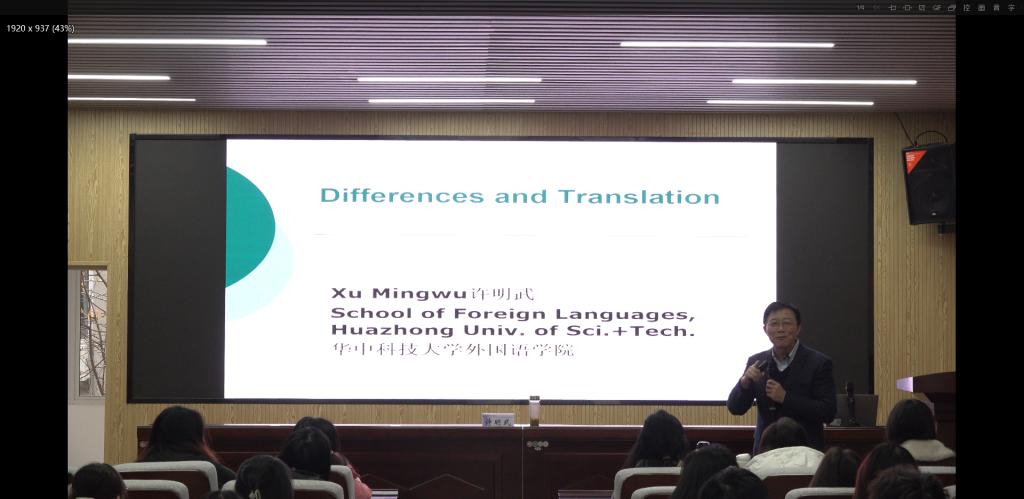 许明武教授以“中西差异与翻译学习”为题,从语言习惯差异、思维习惯差异、传统习俗差异、政治体系差异四个方面阐释了英汉两种语言表达的差异与翻译学习的关系,着重从结构美与意境美、分析语与综合语、繁复与简洁、抽象与具体等几个方面探讨了各类差异对语言表达的影响,进而影响英汉、汉英具体的翻译方法。许教授的讲座生动幽默、案例丰富、深入浅出,同学们听得兴致勃勃,意犹未尽