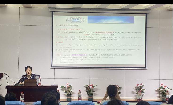徐锦芬教授用通俗易懂的语言,结合实例分析,主要讲述了实证研究定义、研究设计类型、研究设计常见问题等方面内容。徐老师循序渐进、深入浅出地向在场师生分享了宝贵研究经验,最后还对比分析了SSCI期刊与CSSCI期刊论文的写作要求和区别。