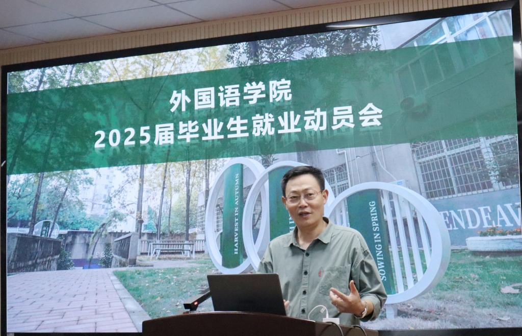 为全面贯彻落实党中央、国务院关于高校毕业生就业工作的决策部署,推动毕业生高质量就业,外国语学院于2024年9月6日(周五)下午19:00召开2025届毕业生就业动员大会暨家校沟通会,指导帮助2025届外语学子了解就业形势,以更加积极的态度、更加扎实的技能、更加坚韧的意志,去迎接未来的挑战。学院党委书记文丽丽、院长段胜峰、党委副书记周芳出席本次大会,会议由就业专干武巧琳主持。全体 2025 届本科和研究生毕业生在三教321报告厅参加会议,毕业生家长通过线上腾讯会议收看现场直播。