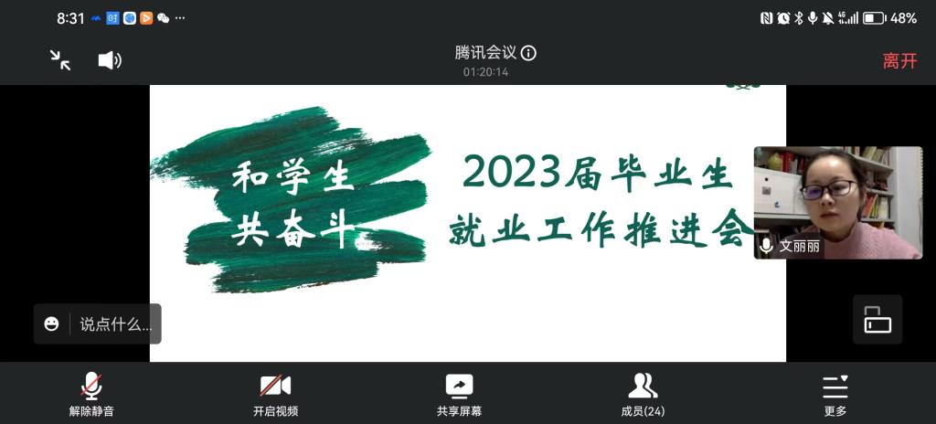文丽丽对各位导师及班主任对学生工作的支持与付出表示了肯定和感谢。她以自己多年来培养学生成长成才的经验举例,提醒班主任和导师在学生面临人生转折点的关键期要伸出援手,积极整合相关资源帮助学生推荐适合且心仪的工作,鼓励全体导师、班主任积极参与到34日春招现场的就业帮扶中来,协力推进2023届毕业生就业工作。