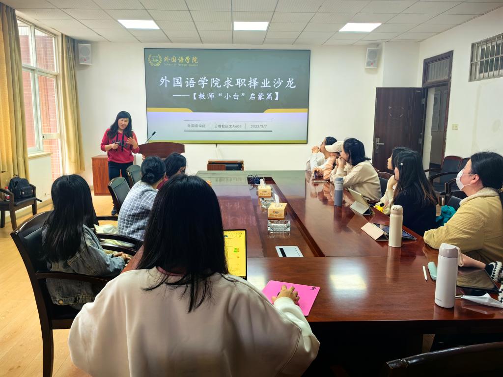 2023年3月7日,外国语学院在文科楼A603组织开展2023年第一期主题求职择业沙龙,此次沙龙的主题是教师“小白”启蒙篇,邀请了公共外语系专业教师钟桂蓉来为11名想毕业做人民教师的毕业生做经验分享与试讲指导,学院党委副书记周芳、学工办辅导员毛婕出席沙龙。