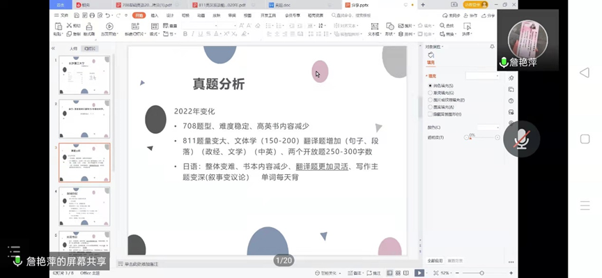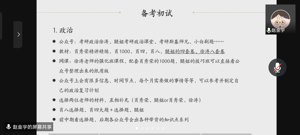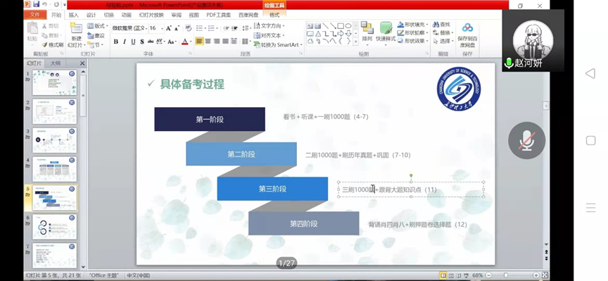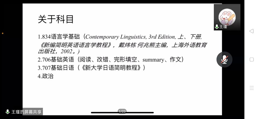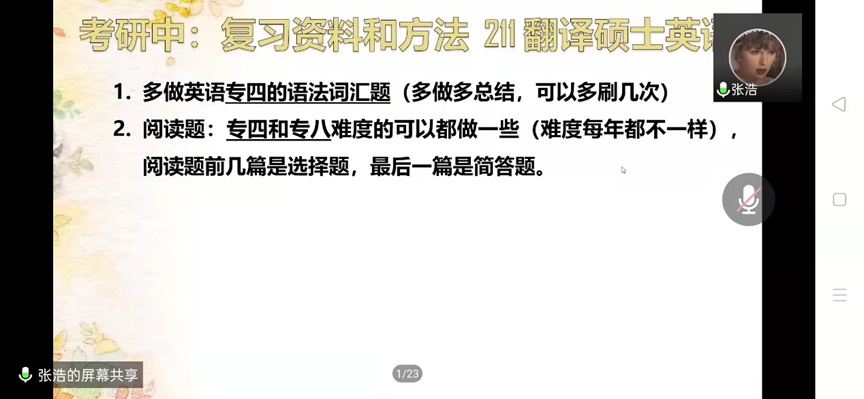 首先,被中国地质大学外国语学院录取的赵河妍分享了她关于择校的经验以及如何确定自己的目标院校,她重点讲解了翻硕考研每个科目备考需要的资料以及相关小程序、公众号和软件等。