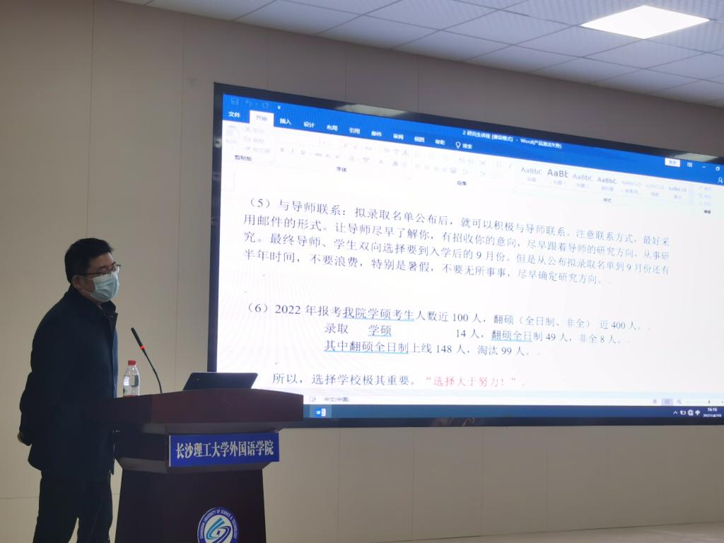 2022年4月19日下午四点,外国语学院在圆厅A100召开2019级考研动员大会。本次大会邀请到了外国语学院分管研究生培养工作的武俊辉副院长来为19级做考研指导,还邀请到了18级詹艳萍同学分享择校经验。学院党委副书记王双出席本次会议。会议由19级年级辅导员龙洋主持。