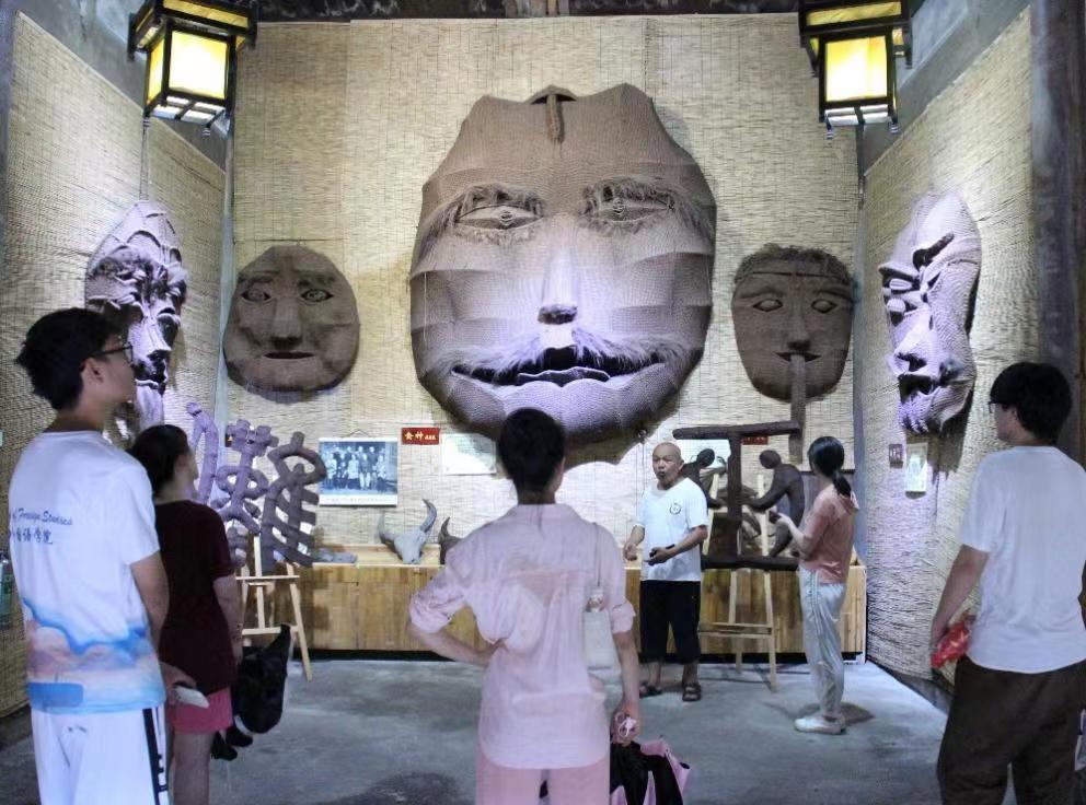 杨汉明是中国古巫傩面具技艺传承人,从事巫傩面具制作四十余年,坚持以文明符号讲述久远历史人物故事以及傩的概念,是怀化市文化产业十大创新人之一。他在将近两个小时的讲解过程中,引经据典地为文化摆渡者们讲解面具的历史渊源,从“食神”“厨神”和“味神”傩神面具背后的故事,讲到“雨神的嘴如船形,代表一帆风顺,下巴有4道突出骨头,是神话中雨神喝酒忘关神器引发洪灾的惩戒。” 同时展示了农耕文明古巫傩文化的一种人文文化工具——棕编面具,带领实践团成员进行现场根雕体验。杨汉明认为保护和传承巫傩文化与根雕艺术是自己的初心和使命,他创建然翔园,火灾中冒着生命危险保护书籍《巫傩祭本》,每次亲自来为参观的年轻人进行详细讲解,都是希望巫傩文化与根雕艺术得以传承。“艺术没有国界,但我不愿意日本人高价买断我的作品,我希望更多的中国人,尤其是你们年轻人学习和传承非遗,我愿意无偿教授年轻人自己毕生的手艺。”