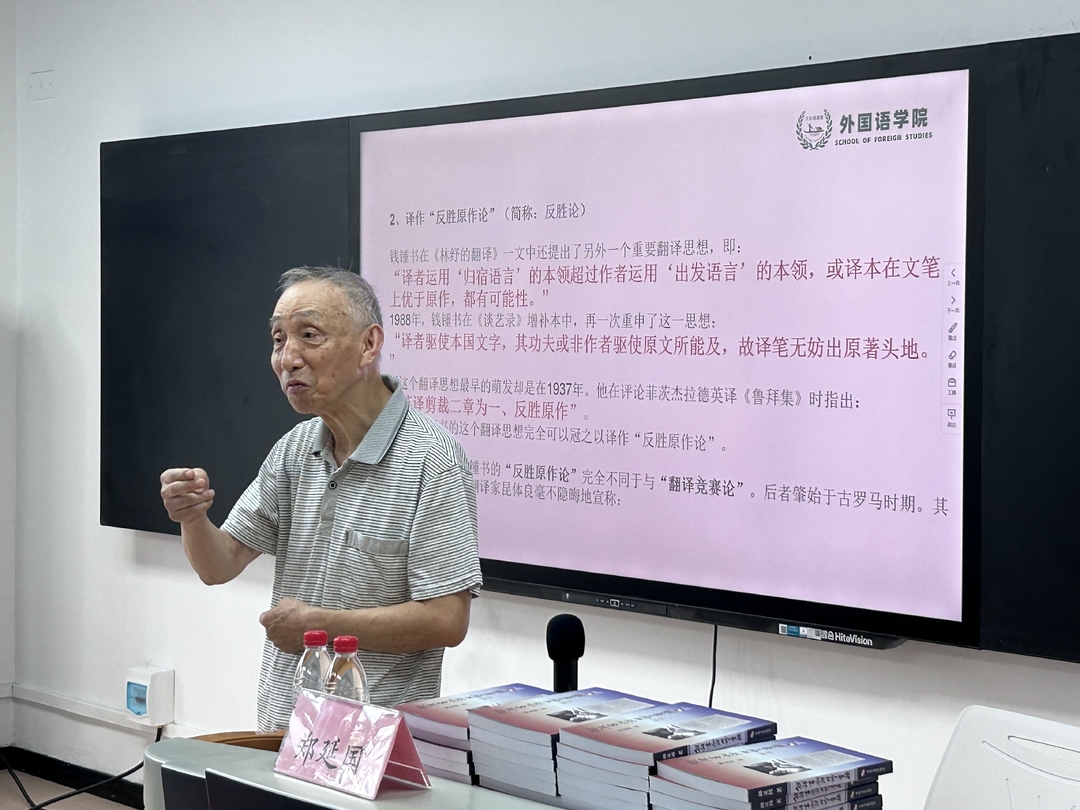 “从事教书育人和关心下一代工作是我的毕生志愿,此次能够为新生上开学第一课我感到非常高兴,希望能让更多学生通过我的课堂感受到翻译的魅力与精髓,帮助更多人学好翻译。”9月19日下午,78岁的退休教师、翻译家及钱钟书研究专家郑延国教授在william威廉中文官网金盆岭校区给外国语学院23级研究生新生开展云影讲坛讲座,讲授入学教育第一堂学术课——钱钟书学术思想和翻译两论。