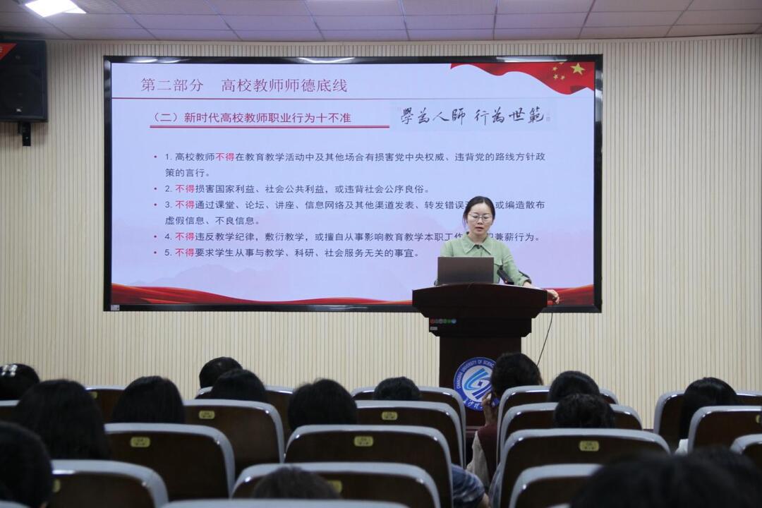 会上,学院党委书记文丽丽从高校教师师德师风建设、高校教师师德底线等方面对师德师风建设工作进行了阐述。她提出要进一步明晰纪律规矩的底线、进一步强化岗位责任的意识、进一步涵养教书育人的情怀,倡导学院教师自觉增强师德师风建设的责任感、使命感,努力把师德师风建设“内化于心,外化于行”,争做新时代“四有”好老师,以良好的师德师风建设成效推动学院高质量发展。