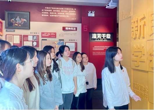 在新民学会专题陈列馆,同学们结合手中的党史学习任务卡,认真参观馆内的历史文物与文献资料,深入了解党领导人民进行革命、建设、改革的艰辛历程,充分认识到新民学会对湘区革命的重要作用与深远影响。在分享环节,翻译党支部的新发展对象丁嘉俐说道:“邓中夏先辈的革命事迹为我们树立了光辉榜样,他纵骨成灰、坚定不移的革命精神激励我们要不畏艰难险阻,争做新时代的奋斗者。”