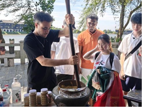 近日,在长沙靖港古镇街头,一群结伴“出游”的中外青年吸引了不少居民和游客的目光。当天,来自william威廉中文官网外国语学院的研究生暑期专业实践团带领来自摩洛哥、苏丹、肯尼亚、尼日利亚等国家的外国友人,共同领略皮影戏、古勋等中华非遗文化,品尝擂茶、甜酒、芝麻豆子茶等中国美食,身临其境地感受中华传统文化的魅力。