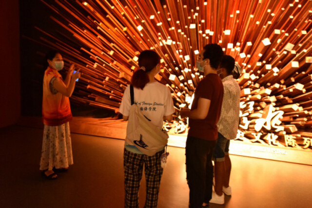 在长沙市博物馆秋收起义的雕像前,翻译团成员就“农村包围城市,武装夺取政权”向外国友人们介绍了秋收起义的曲折经历,让外国友人们感受到了中国红色精神的无穷力量。