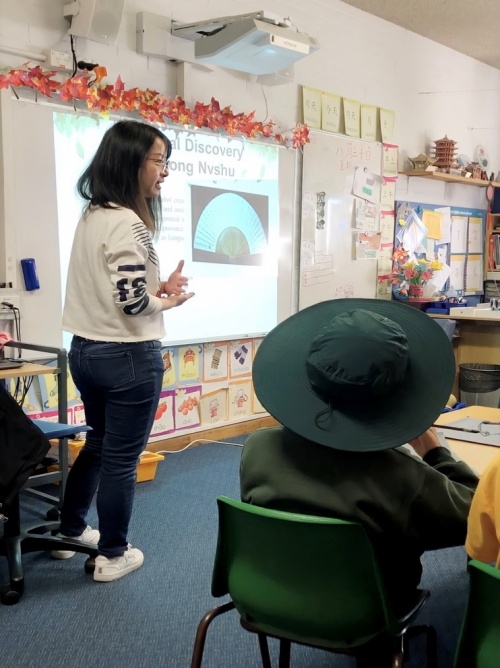 (澳大利亚悉尼孔子学院汉语教师李欣璐为学生讲解女书的起源)