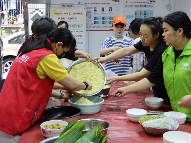 一大早,志愿者们就与社区的工作人员们一起为今日的活动准备好粽叶、糯米、红枣、绿豆等材料。“粽子的包法多种多样,而且随粽叶不同而不同。就粽子的形状来说,有夹脚粽、三角粽、小脚粽……”社区的老人们兴致勃勃向志愿者们展示不同粽子的包法和系法。一会儿功夫,一桌 “粽子宴席”就出炉了。
