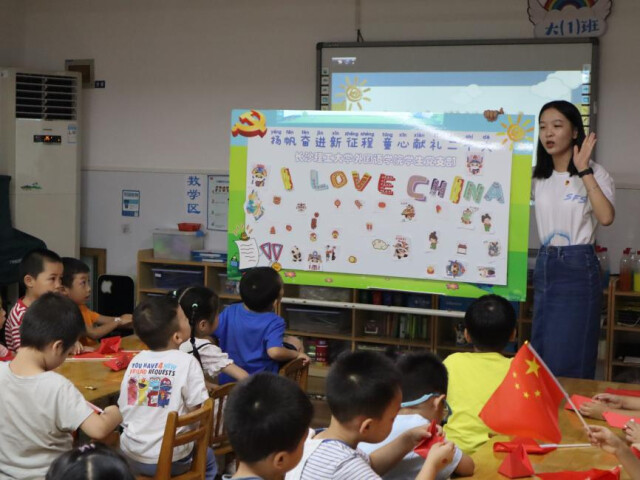 英语党支部学生副书记王菊芳介绍到,“我们一直在思考如何才能让党的光辉历史和英雄事迹鲜活有趣起来,所以教学环节花了很多时间和心思设计,如绘本故事‘小英雄雨来’是为了培养儿童英雄主义的价值观,折红船是为了引导小朋友们了解南湖红船的故事,手势舞《童心向党》旨在孩子们心中厚植爱党爱国情怀。”