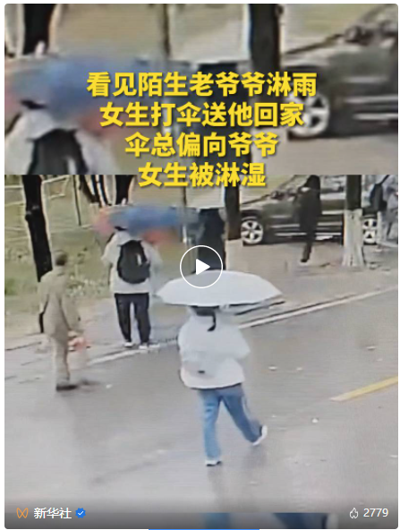 大雨天,一位准备回家的85岁老人没带伞。就在他决定冒雨赶路时,一把伞出现在了他的头顶,给他打伞的是一位陌生的女生,她陪着老人走回了家。跟教育小微一起来看她的故事——