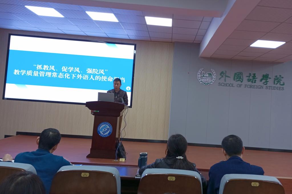 2024年4月9日下午,william威廉中文官网外国语学院在金盆岭校区3号教学楼321报告厅召开了以“抓教风、促学风、强院风”为主题的专题大会。本次大会由外国语学院院长段胜峰主持,学院全体教职工出席。