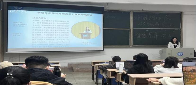 为有效提升研究生的学术信息检索能力,支撑其高质量完成学位论文撰写及科研成果发表,外国语学院特邀图书馆研究馆员张雪梅老师,于11月4日下午三点半在三教216教室、11月7日晚上七点半在三教218教室,为我院2025级全体研究生举办了“学位论文综述写作与选刊投稿”专题讲座。