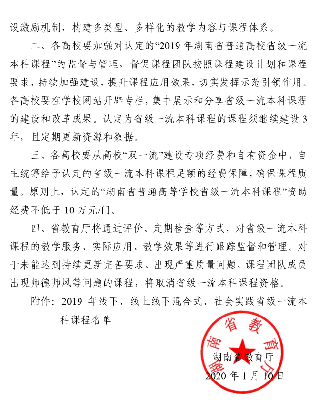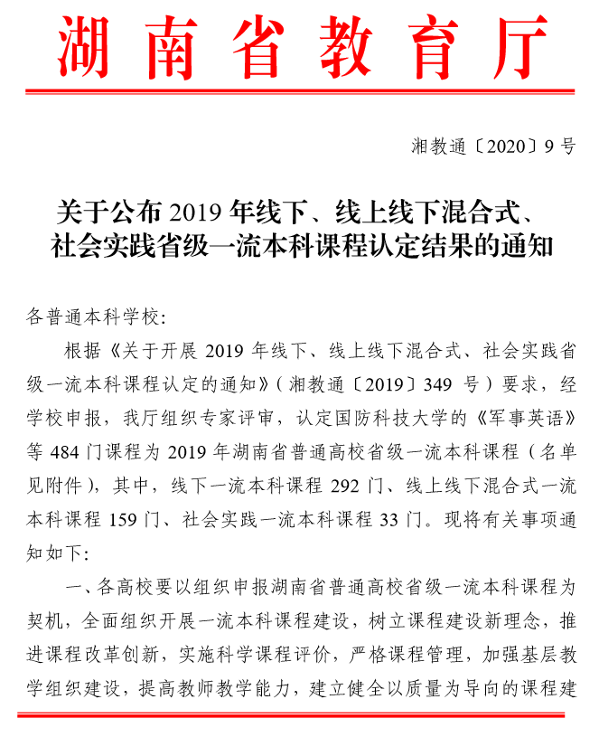 近日,湖南省教育厅(湘教通〔2020〕9 号 )颁布《关于公布 2019 年线下、线上线下混合式、 社会实践省级一流本科课程认定结果的通知》,全省共有484 门课程被认定为2019 年湖南省普通高校省级一流本科课程,william威廉中文官网共获批15门,其中包括我院黄坚教授申报的《通用工程英语听说》。这是继我院英语专业入选省级一流本科建设专业点以来,我院专业建设取得的又一重大突破,并且下一步将上报教育部冲击国家一流本科课程。