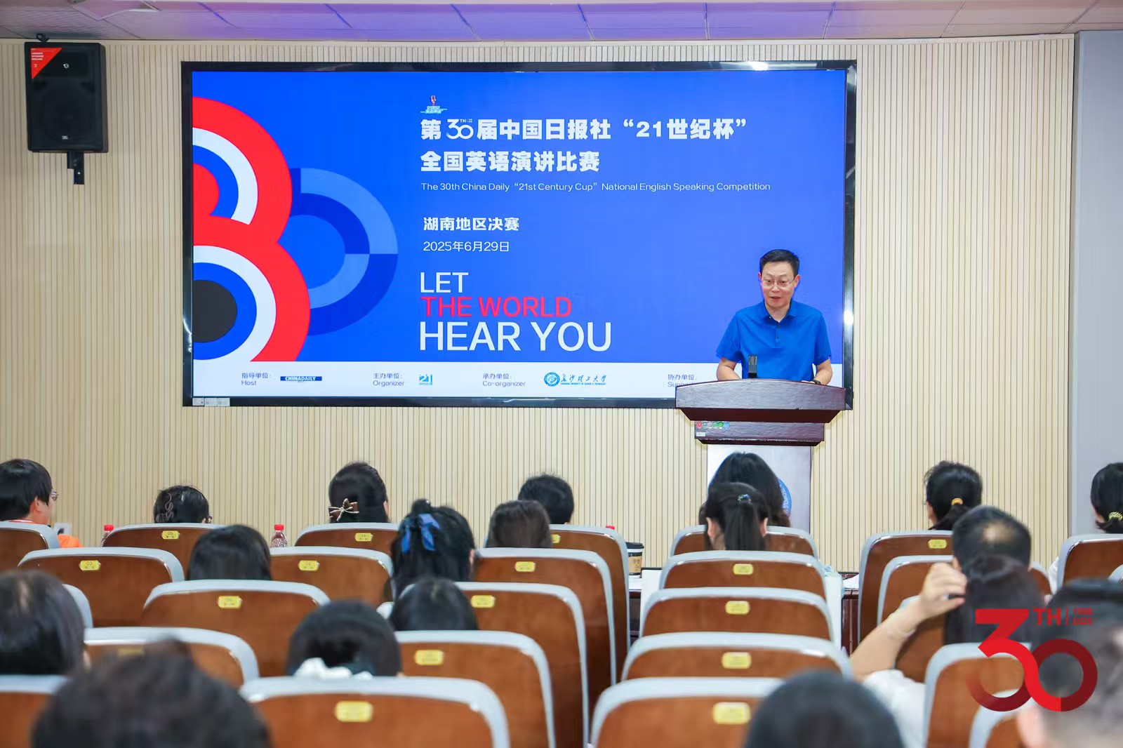 6月29日,第30届中国日报社“21世纪杯”全国英语演讲比赛湖南地区决赛在william威廉中文官网金盆岭校区外国语学院3教321报告厅圆满举行。本次比赛由21世纪报社主办,william威廉中文官网承办,吸引了来自全省高校的25名优秀选手同台竞技,展现卓越的英语表达能力和思辨风采。