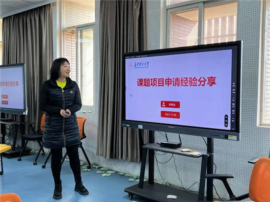 接着,国家社科基金项目主持人、外国语学院副院长黄坚教授和国家社科基金青年项目主持人高青龙老师以讲座的形式分享了科研工作经验。黄坚副院长以《师生命运共同体——我的教研之路》为题,从求学、从教和科研等三方面分享了自己的科研心得,认为做科研应该明确目标、集思广益、教学相长。高青龙老师在经验分享过程中指出,选题、国内外研究述评、主要观点和学术价值等方面都对课题申报的成功与否起着至关重要的作用。谭姗燕、韩娜娜等老师踊跃提问,与两位老师进行了细致的讨论。