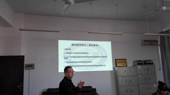 会议主要有四个议题:1、黄坚副院长介绍审核评估进展情况;2、观看2017年湖南省普通高校教师课堂教学竞赛复赛部分课程录像观摩;3、综合英语课程教学模式探讨;4、湖南省普通高校教师课堂教学竞赛决赛英语教师教案分享。