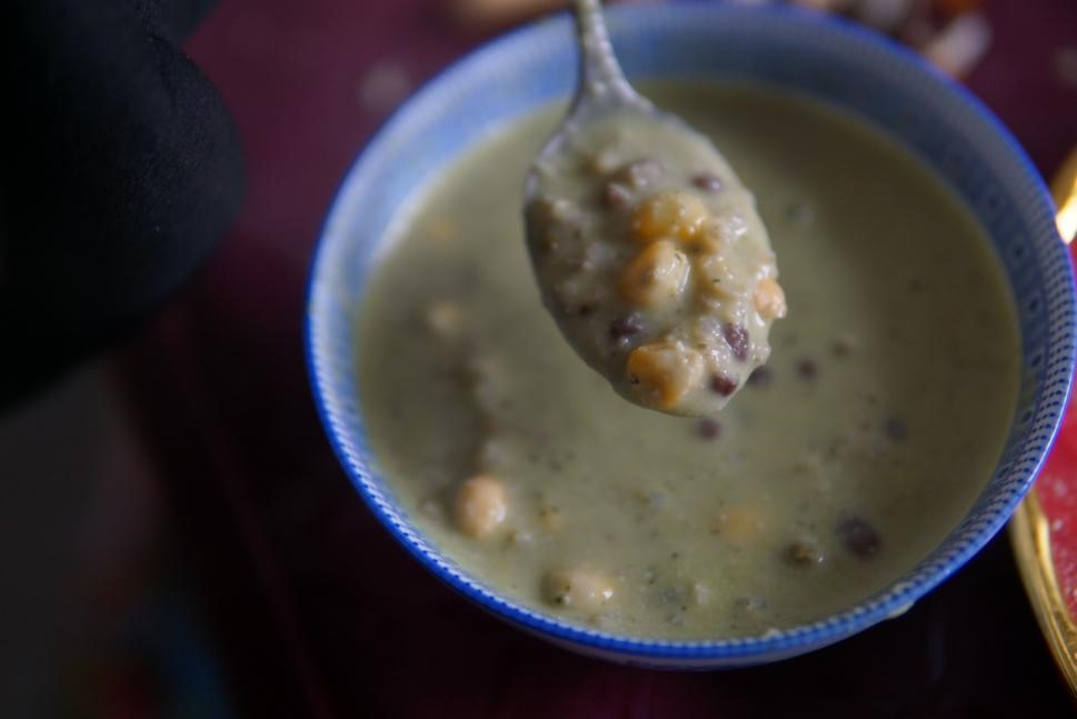 在此次活动中,彭依梦学习并实践了做擂茶的过程。擂茶制作用料很讲究,制作擂茶时,按一定比例加入上等茶叶、大米、豆、花生、芝麻、玉米等,放进陶制擂钵,用茶枝做成的圆头擂棒,细细地研碎,磨成泥状后倒进茶钵里备用。最后冲开水和匀,加上炒米,擂茶就完成了。