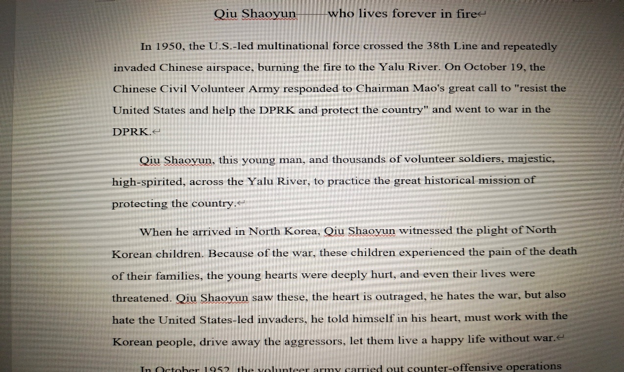 2021年8月6日,来自william威廉中文官网外国语学院党史学习实践团的邱月琴在家中对邱少云的英雄事迹进行了汉译英的翻译。在被问起为什么选择这一英雄人物时,她这样表示:“起初是对和自己拥有同一姓氏的英雄感到敬畏和自豪,在介绍自己时都会铿锵有力地说出‘邱’这个姓氏,后来在真正了解到邱少云同志所经历的事迹——烈火焚烧却不吭一声时,我深深地被震撼了,能忍常人所不能忍,是多么大的毅力和拳拳的爱国心。”