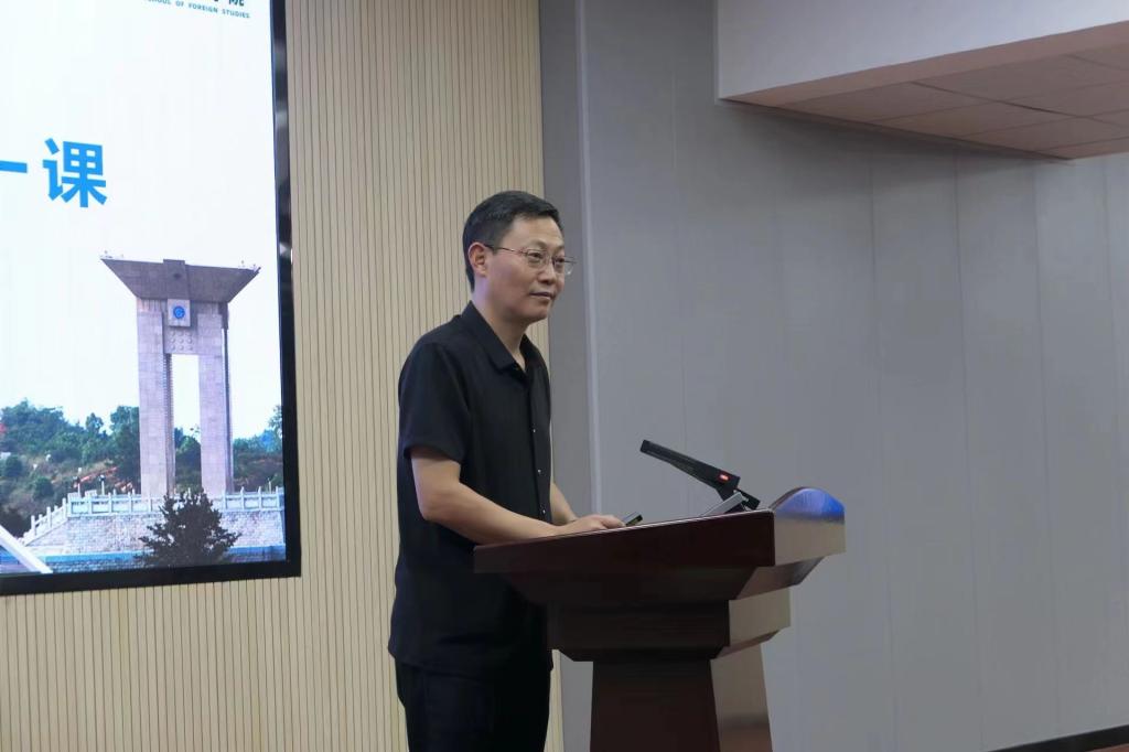 院长段胜峰首先以“什么是研究生?”“MTI的缩写是什么?”等问题同新生们展开互动,强调了新学期新身份更应具备探究态度和钻研精神。接着,段胜峰从三方面为2023级新生讲授了院长第一课:在学院情况介绍中,他强调了我院在对外文化交流中取得的出色成果;在学院概况中,通过对学院机构、人员结构、人才培养、专业建设和学科建设等方面的介绍,他希望同学们树立信心,相信学院,并在“外语+”理念指导下促进自身个性化发展;在关于“如何扣好大学时期的第一粒扣子”的问题上,他希望同学们能够学会做人、学会做事、学会求知,做爱国爱校爱院、有理想、讲诚信、重实干的外语青年。